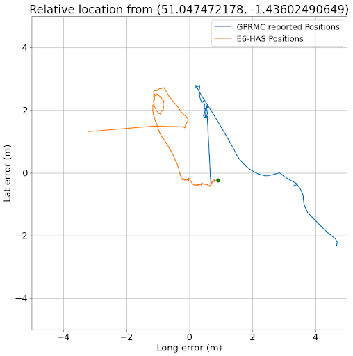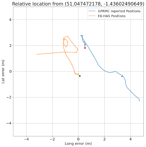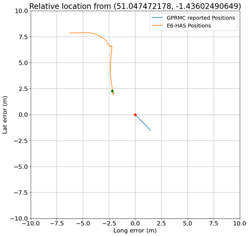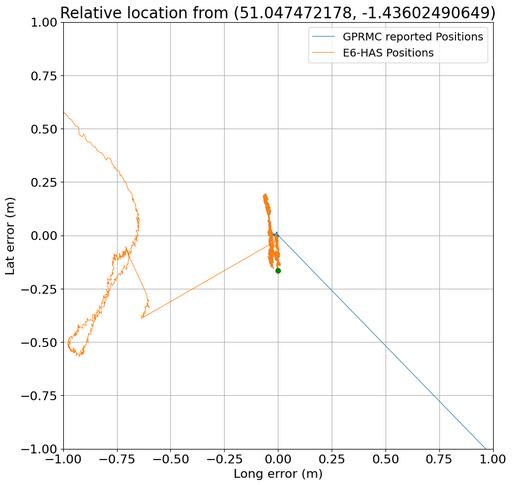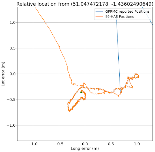 This above graph shows the UM980 best estimate position output(blue line, red dot) using the position generated using RTK, as this is accurate to around 2cm, whereas the E6-HAS position(orange line, green dot) is around 2.5m out in both latitude and longitude.