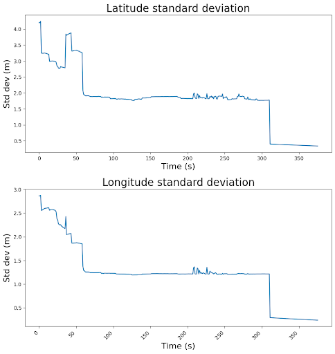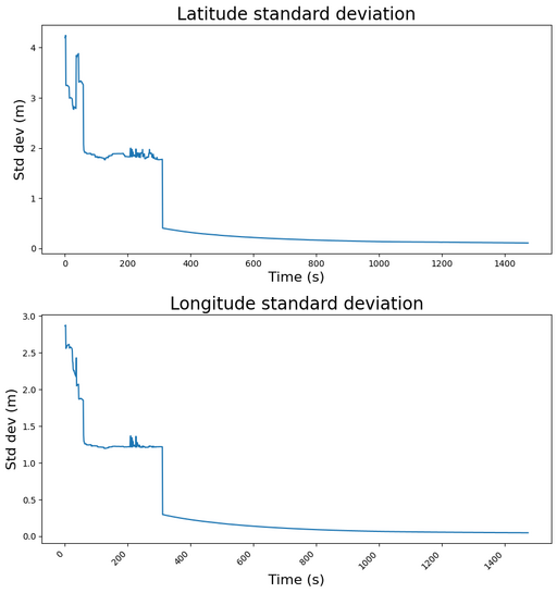 The graph above illustrates the standard deviation reported for the UM980's main position output. This is a metric for the error in the estimated position at that time. The standard deviation of latitude can be seen to slowly decrease from 4 meters at the start to around 1.5 meters over a period of a minute and a half. The error then stays at around 1.5 meters, which is the expected accuracy of using standard GNSS methods. Then at 330 seconds a large drop down to less than 30cm can be observed where the UM980 switches to using the E6-HAS solution as its best estimated position solution.