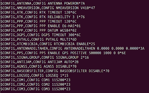 The receiver is first configured to the above configuration and then configured to output the following messages at 10Hz (Full definitions found here):